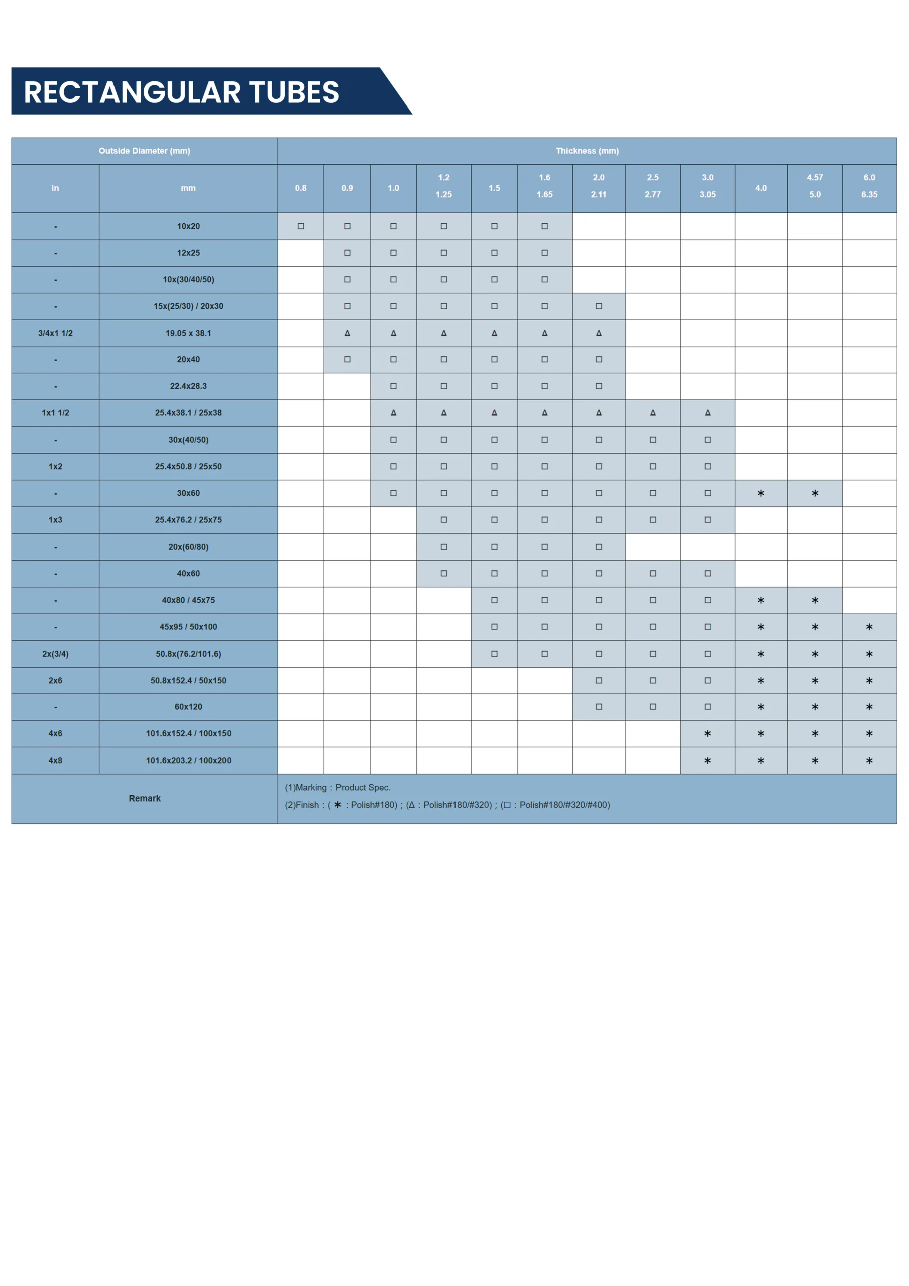 Our stainless steel rectangular tubes are available in sizes from 10×20 mm to 100×200 mm. Wall thickness ranges from 0.8 mm to 6.0 mm. They are available in grades including 304 and 316L. Surface finishes can be selected based on your needs. We can handle both standard bulk orders and custom size requests.