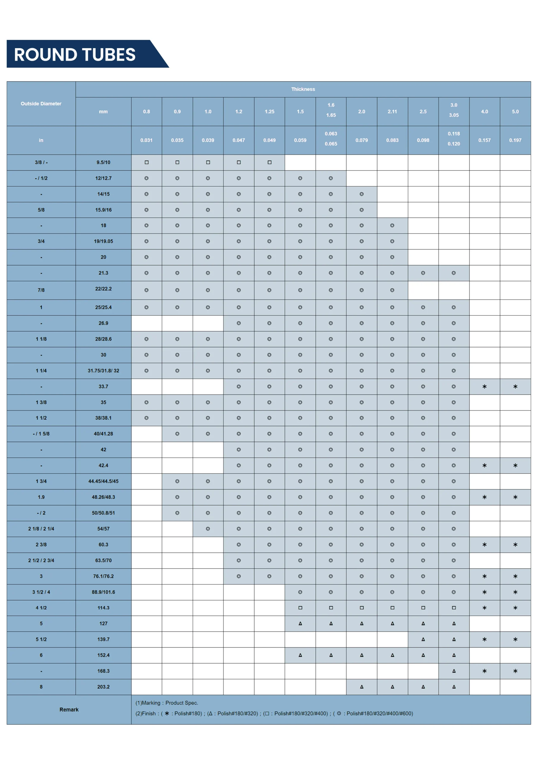 Our stainless steel round tubes are available in outer diameters from 9.5 mm to 215 mm. Wall thickness ranges from 0.8 mm to 5.0 mm. They are available in grades such as 304 and 316, and can be supplied in various surface finishes including satin, hairline, and mirror. Custom cut lengths and non-standard sizes are also available.